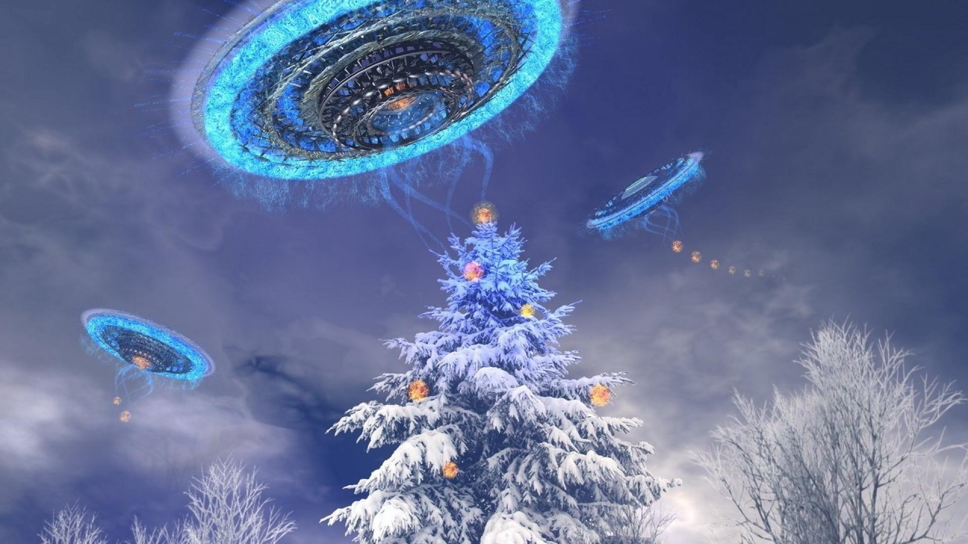 Инопланетные летающие тарелки на фоне елки - обои на телефон