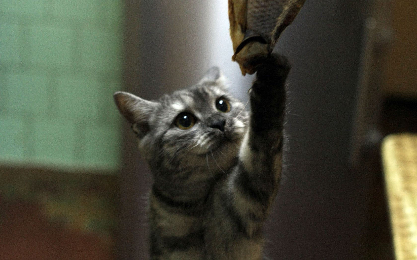 Кошка тащит рыбку со стола - обои на рабочий стол