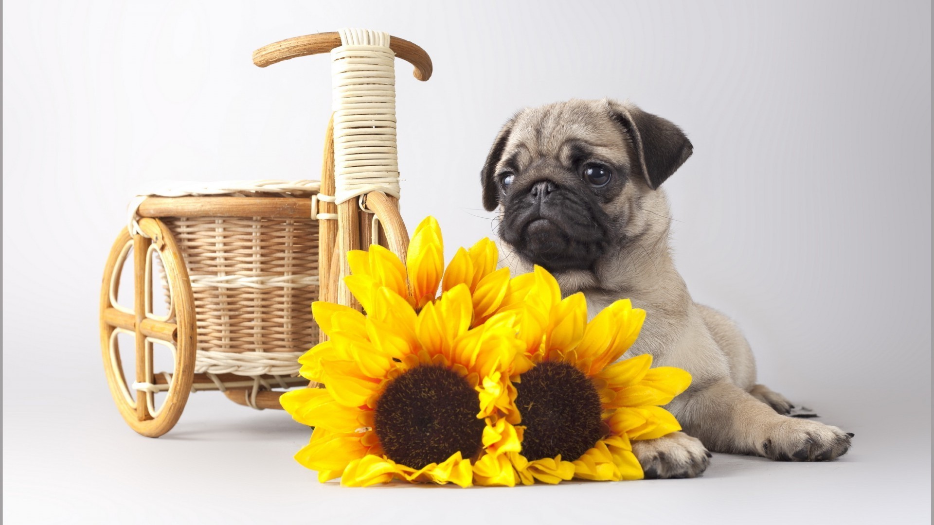 Желтые подсолнухи. Милый пёсик - обои на рабочий стол